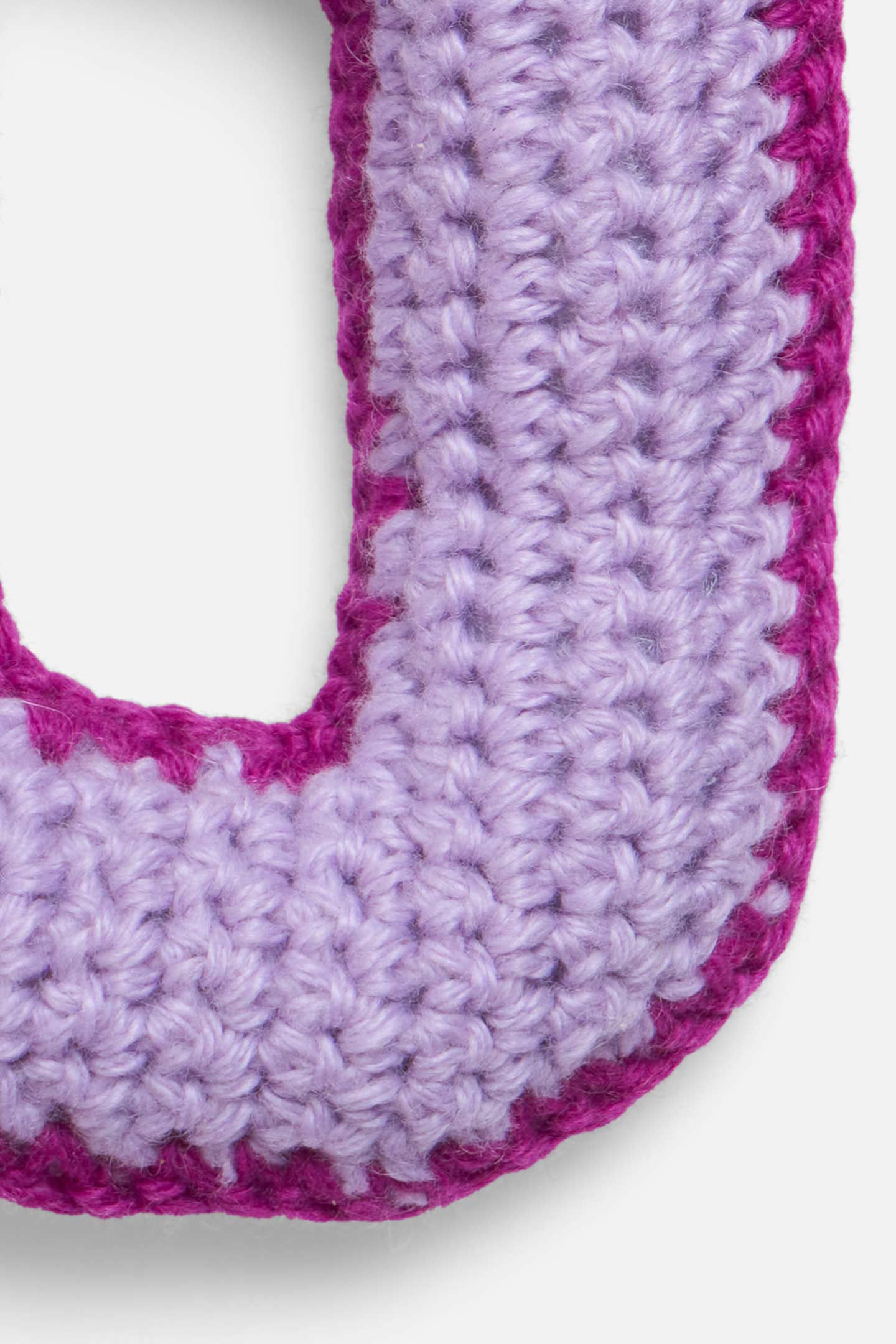 Alphabet letter-shaped crochet keychain charm in cashmere with a metal lobster clasp.