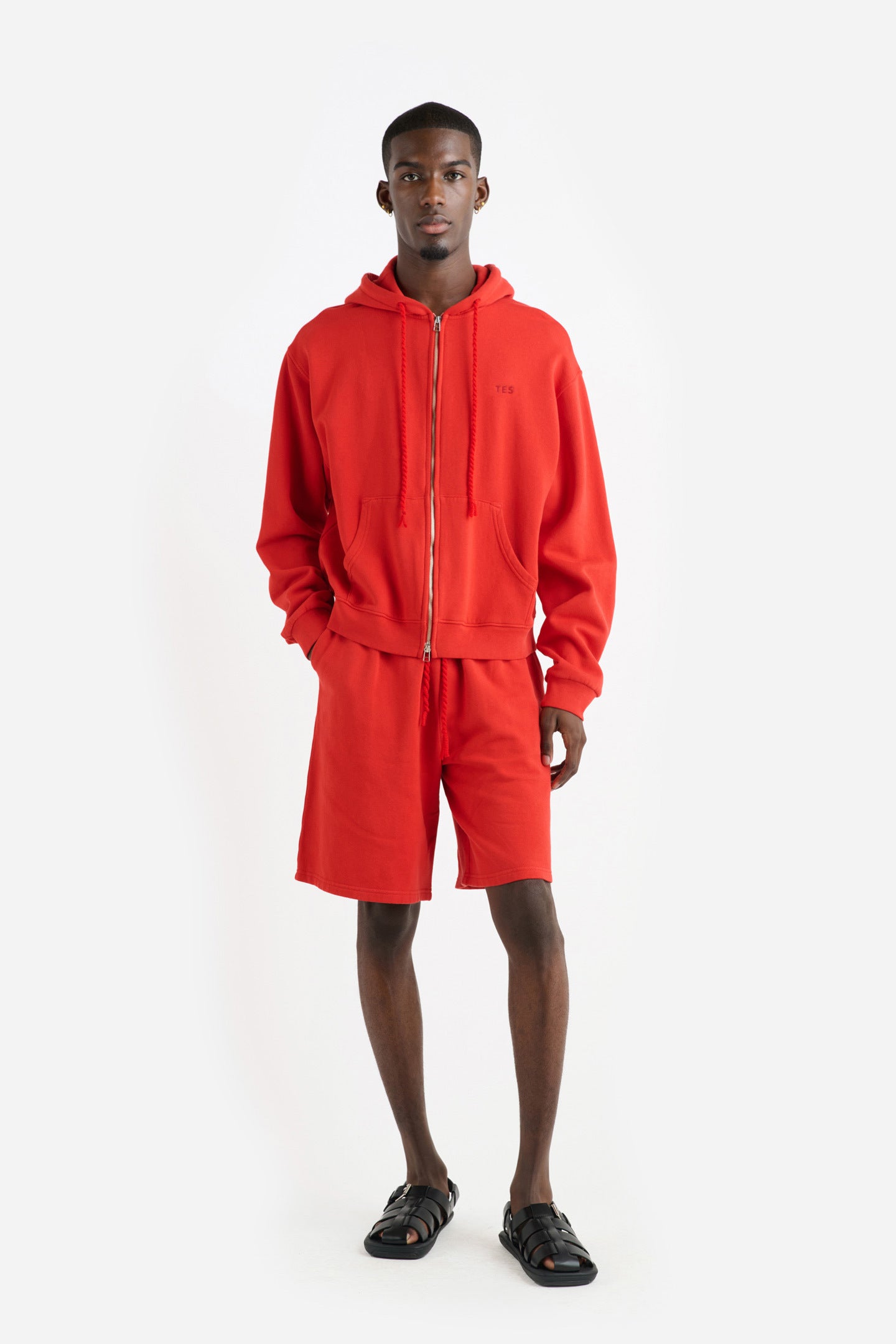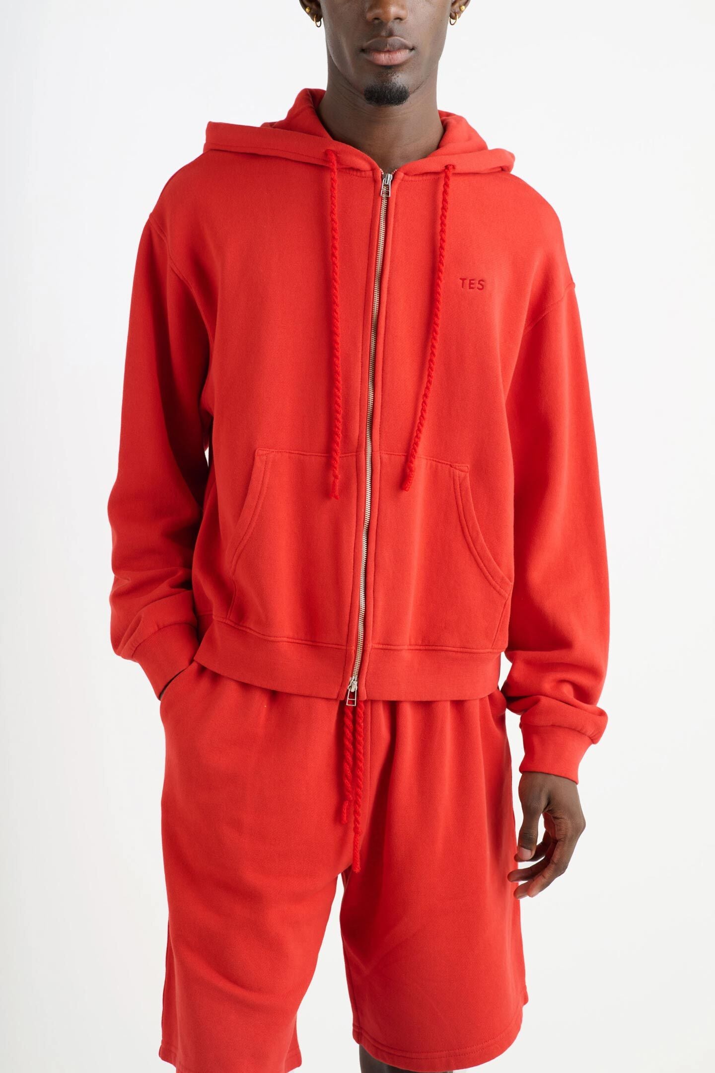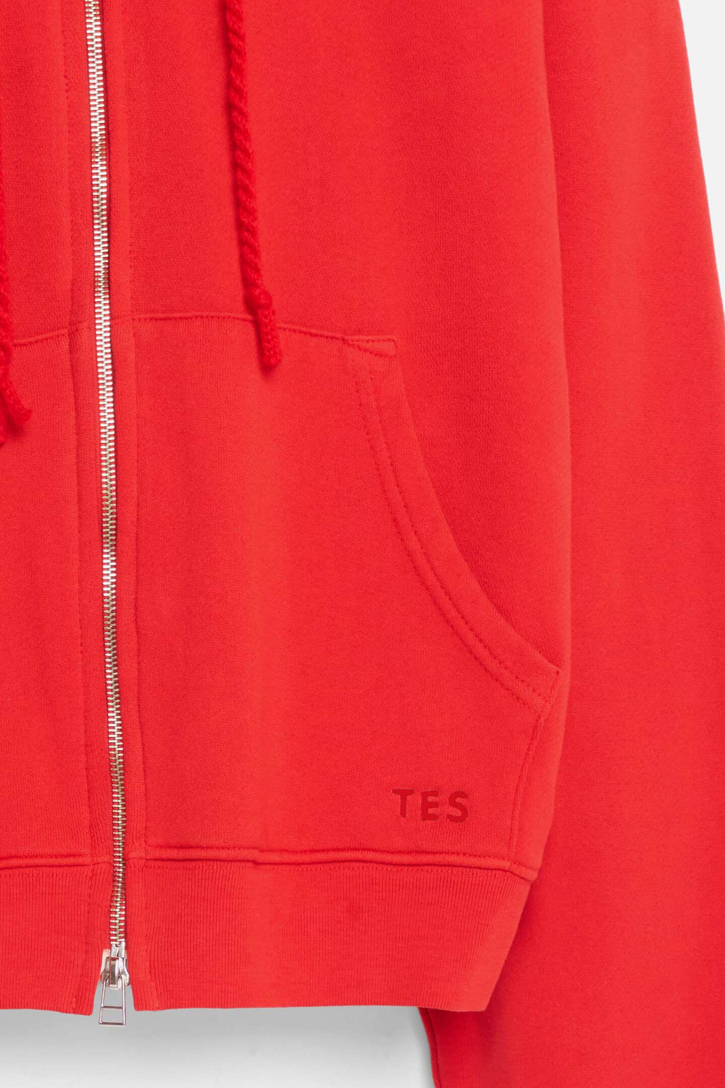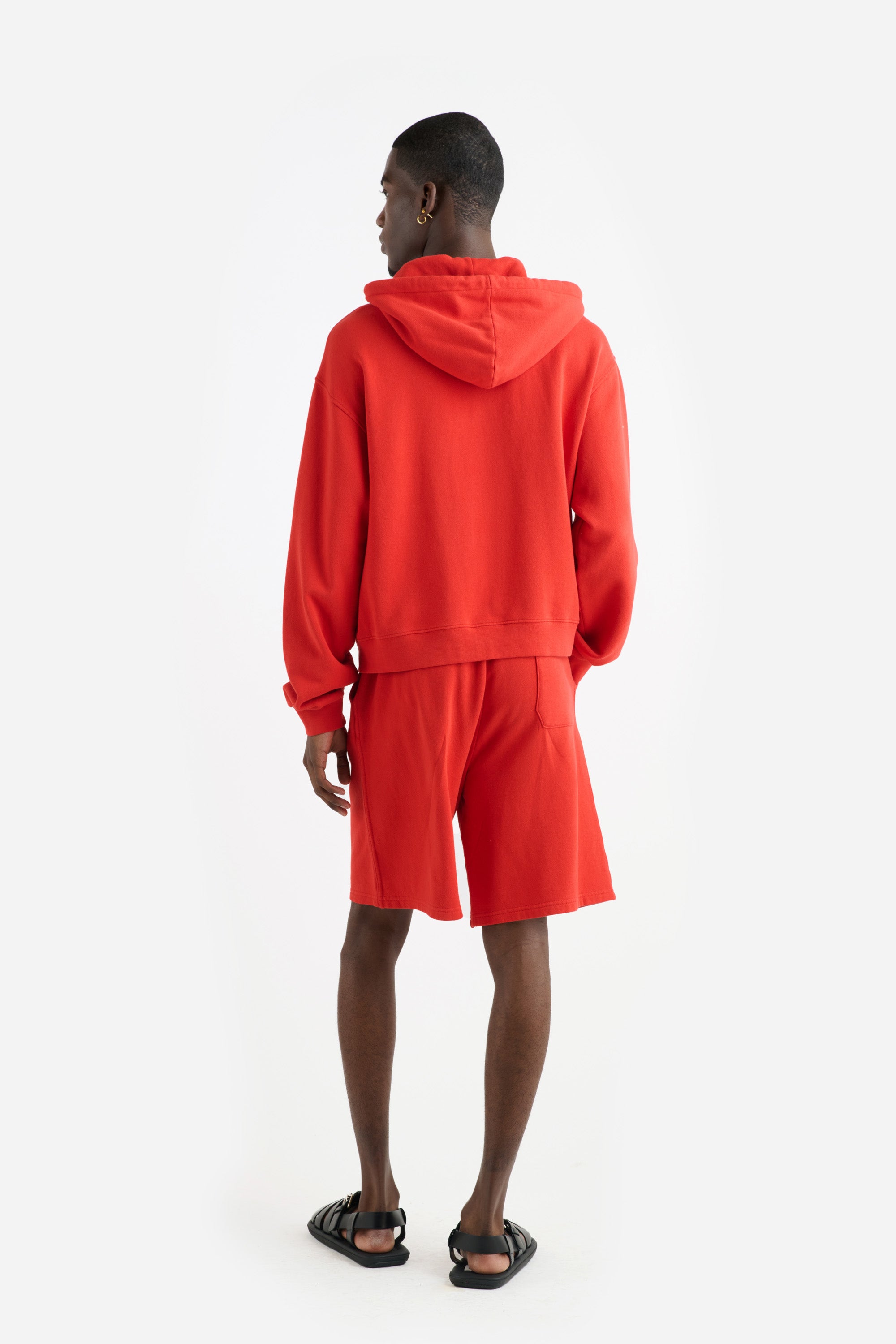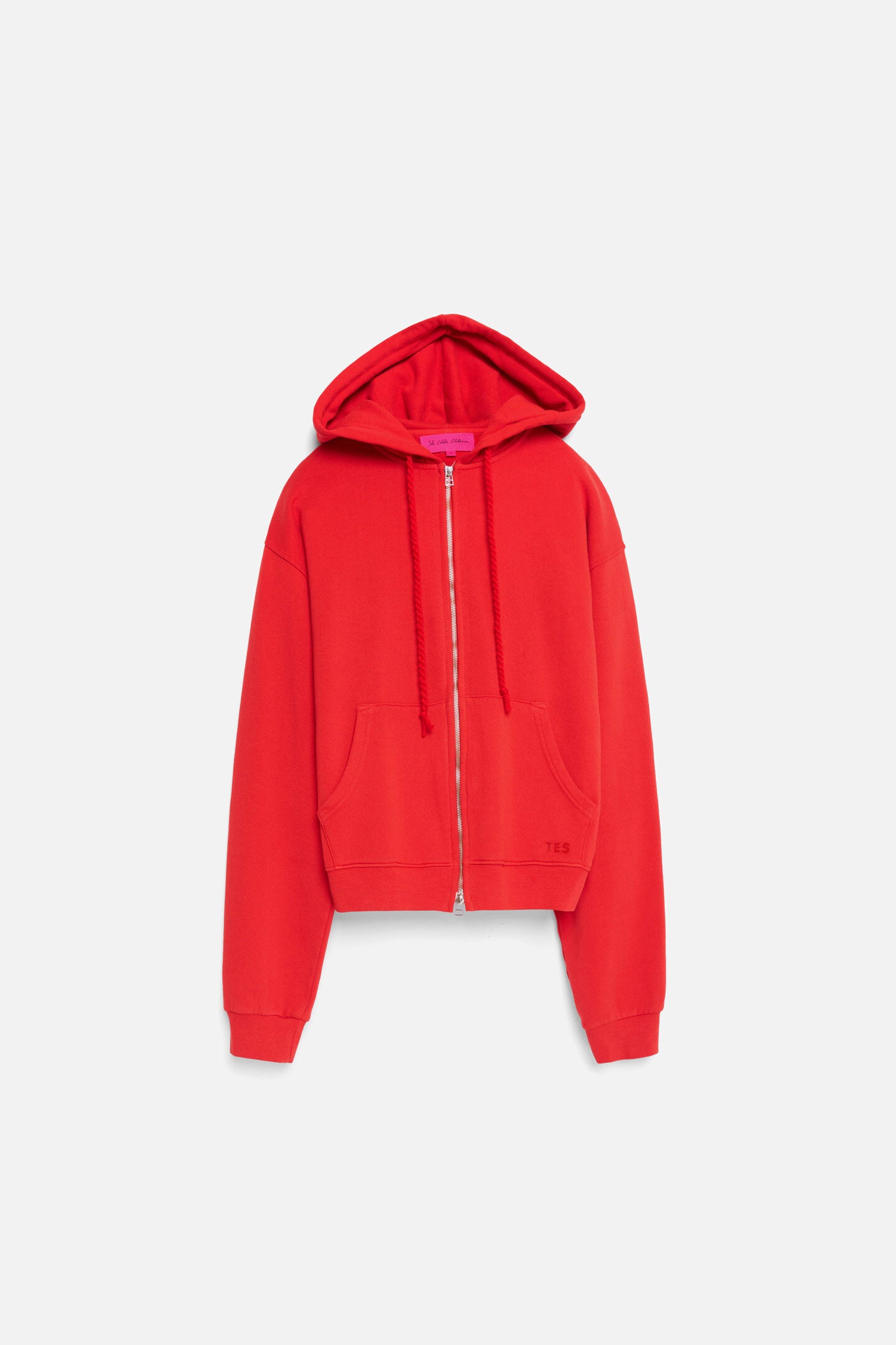 Relaxed hooded sweatshirt in cotton and cashmere with side seam pockets, cashmere drawcord, and two-way zipper closure at center front.