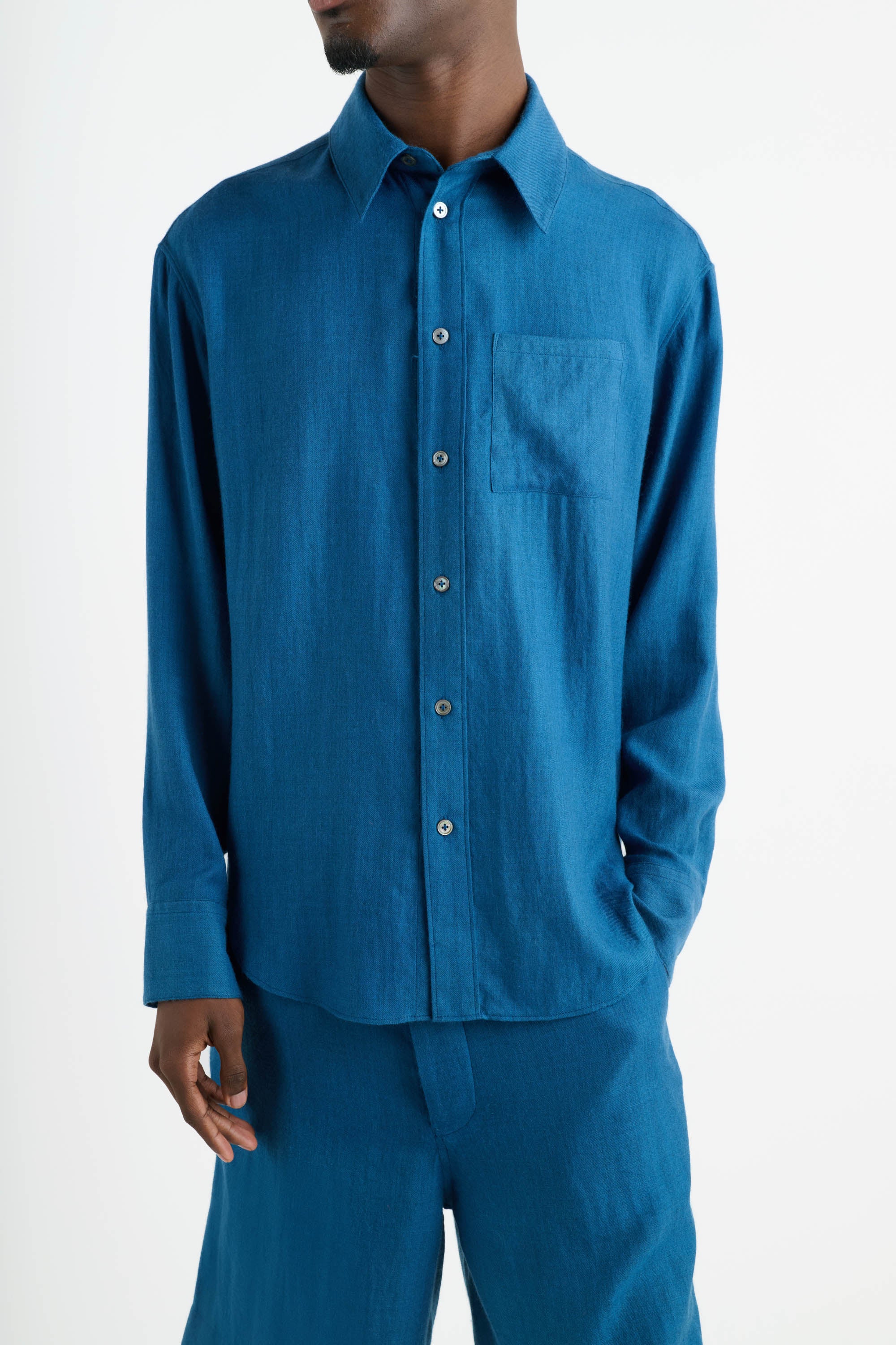 Classic button-up in lightweight cashmere and wool with a 7-button closure and chest pocket.